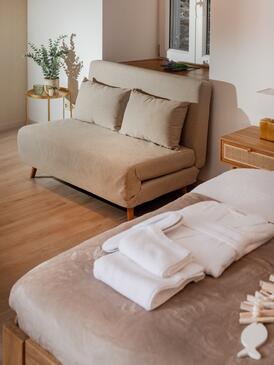 Az Ház 6 főt tud fogadni. Az ágyak a/az 2 hálószobában, és a nappaliban/ben vannak, melynek méretei 133m2. A forró nyári estéket a vendégek saját teraszukon élvezhetik. A szállásegységbe lehetséges háziállatot hozni felár ellenében.