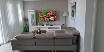 Az Apartman 6 főt tud fogadni. Az ágyak a/az 3 hálószobában vannak, melynek méretei 95m2. A forró nyári estéket a vendégek saját teraszukon élvezhetik. Az apartmanból tengerre néző kilátás nyílik. A közös barbecue-helyet a vendég szabadon használhatja.