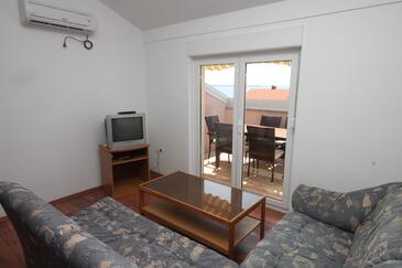 Az Apartman 6 főt tud fogadni. Az ágyak a/az 2 hálószobában, és a nappaliban/ben vannak, melynek méretei 50m2. A forró nyári estéket a vendégek saját teraszukon élvezhetik. Az apartmanból tengerre néző kilátás nyílik. A közös barbecue-helyet a vendég szabadon használhatja.