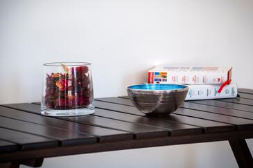 Az Apartman 4 főt tud fogadni. Az ágyak a/az 2 hálószobában vannak, melynek méretei 54m2. A forró nyári estéket a vendégek saját balkonukon élvezhetik. Az apartmanból tengerre néző kilátás nyílik. A közös barbecue-helyet a vendég szabadon használhatja. A szállásegységbe lehetséges háziállatot hozni felár ellenében.