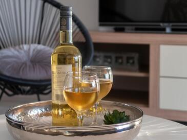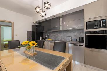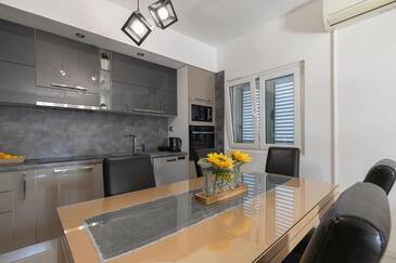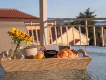 Az Apartman 5 főt tud fogadni. Az ágyak a/az 2 hálószobában, és a nappaliban/ben vannak, melynek méretei 80m2. A forró nyári estéket a vendégek saját teraszukon élvezhetik. Az apartmanból tengerre néző kilátás nyílik. A közös barbecue-helyet a vendég szabadon használhatja. A lefoglalt szállásegység bizonyos helyiségei nem összekötöttek.
