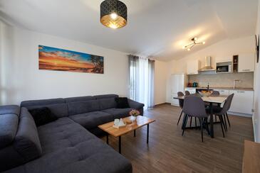 Az Apartman 6 főt tud fogadni. Az ágyak a/az 3 hálószobában vannak, melynek méretei 77m2. A forró nyári estéket a vendégek saját teraszukon élvezhetik. Az apartmanból tengerre néző kilátás nyílik. A közös barbecue-helyet a vendég szabadon használhatja. A vendégek itt tartózkodásuk ideje alatt kikapcsolódás céljából használhatják a magán medencét.